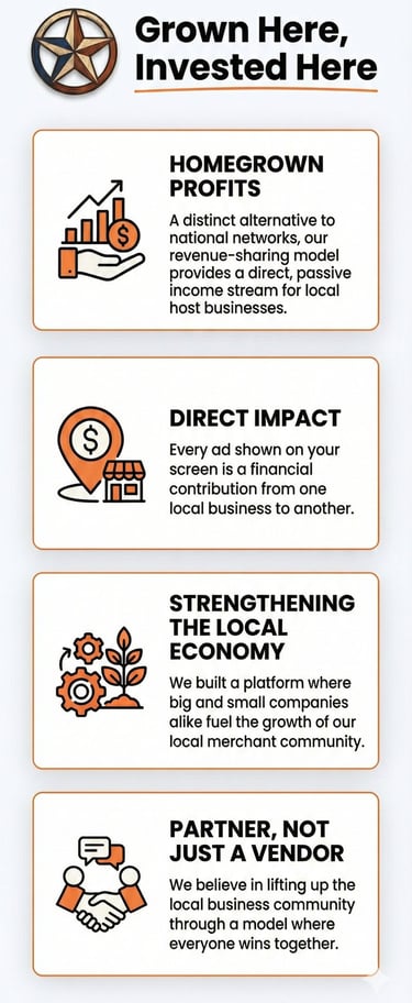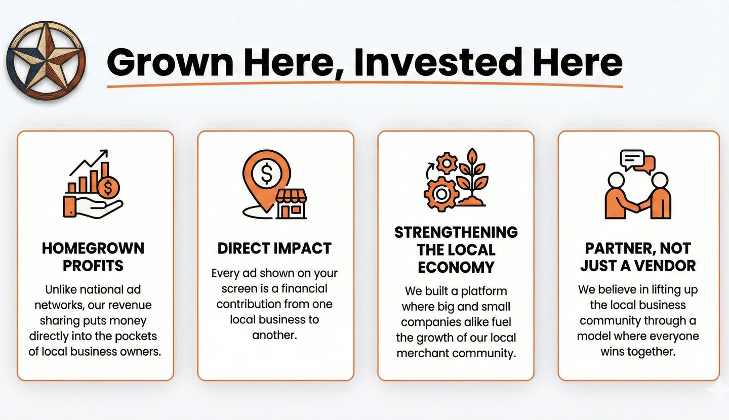 Lonestar Digital Media empowers local businesses to connect directly with their communities through high-visibility digital screens placed in popular local spots. By showcasing ads and announcements where people naturally gather, we help brands stay local, relevant, and seen. Our network ensures that your message reaches the right audience — your neighbors, customers, and community — without being lost in the noise of citywide advertising.